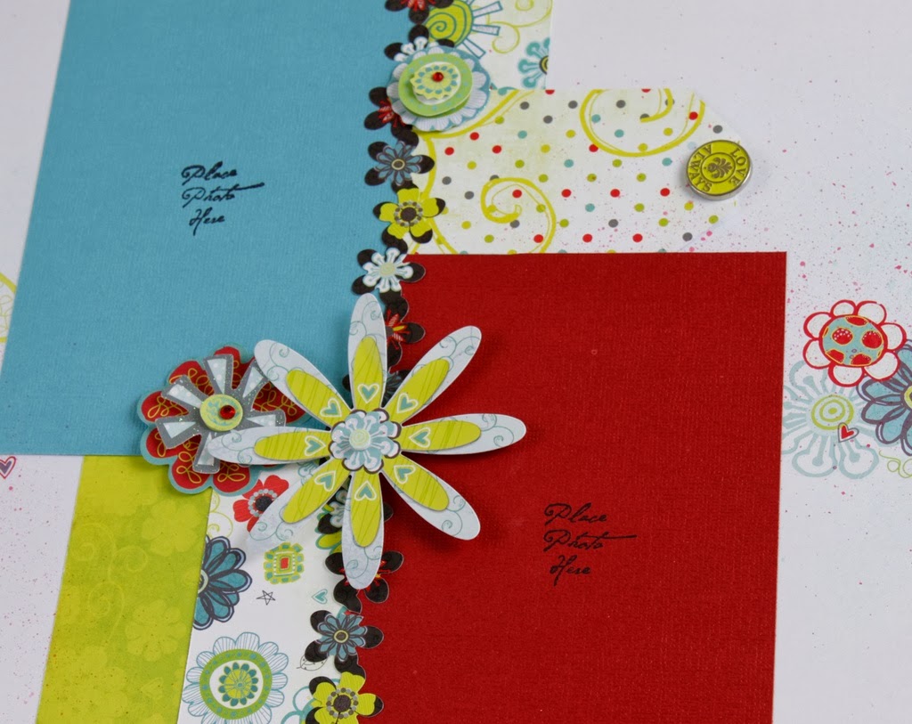 I placed each element on 12 x 12" pieces of solid white cardstock for this layout.  I wanted a lot of open white space - not too busy looking - but then I felt it needed a little something extra in the white areas so I sprayed a spritz here and there of a light aqua ink watered down a bit with a Stampin Up spritzer - then over top of that I "sprayed" red ink - but the red I applied by rubbing a tooth brush over my ink pad and then just "spraying" the ink. This is a fun technique but oh! did my fingers get inky!! heehee