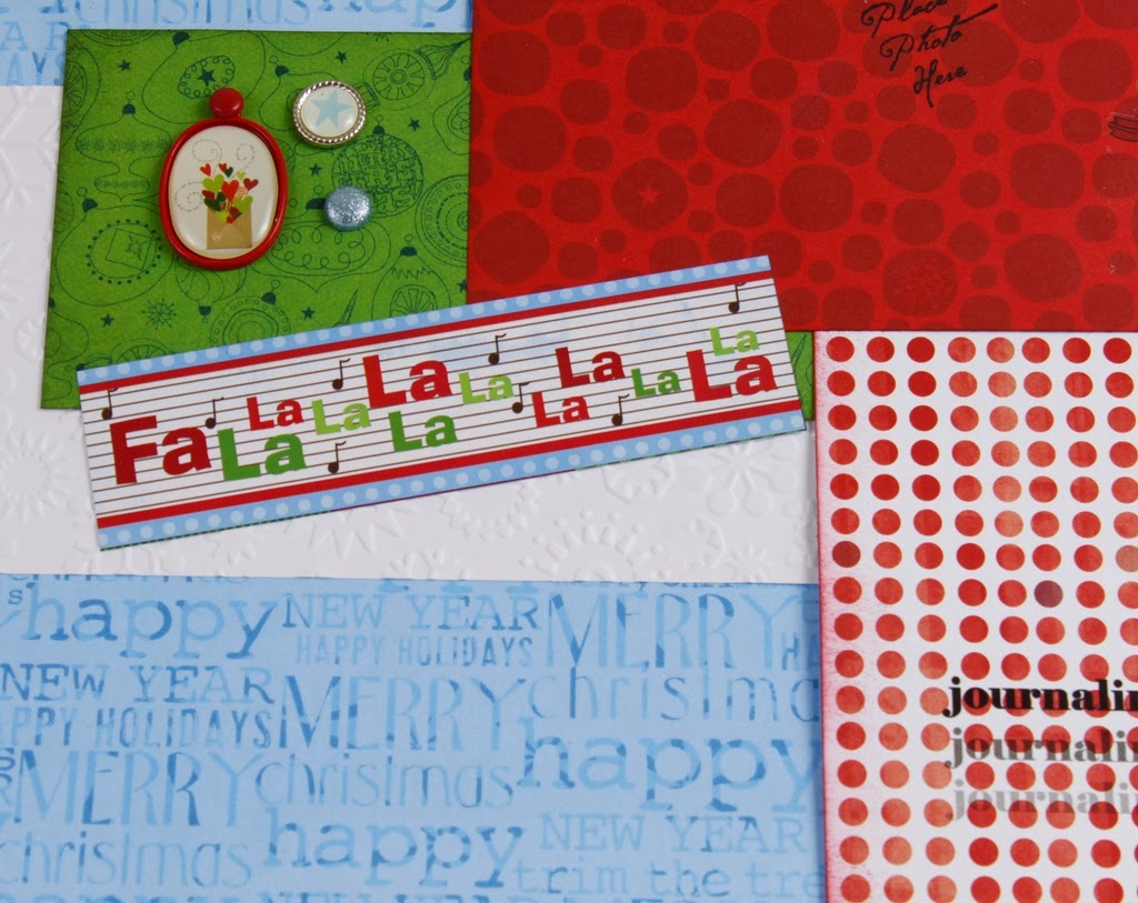 I embossed the white strip of paper with the Snowflake Cuttlebug folder. My "Title" Fa La la la la la" is a sticker from.... you know! as are the sweet little brads. The "journaling" tag was printed on my computer. The little present on the photo section is a Rub-On. : )