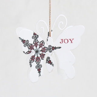 This little sweetie is about 1.75" high and 2" wide. In the same manner I cut two butterflies from 51-110 Flicker & Flutter - stamped them with a snowflake from #30-307 Holiday Snippets. The word Joy is also from Holiday Snippets. I colored the snowflake with a hint of Red and Aqua. And glued them together - this one with a Copper Thread from my stash.