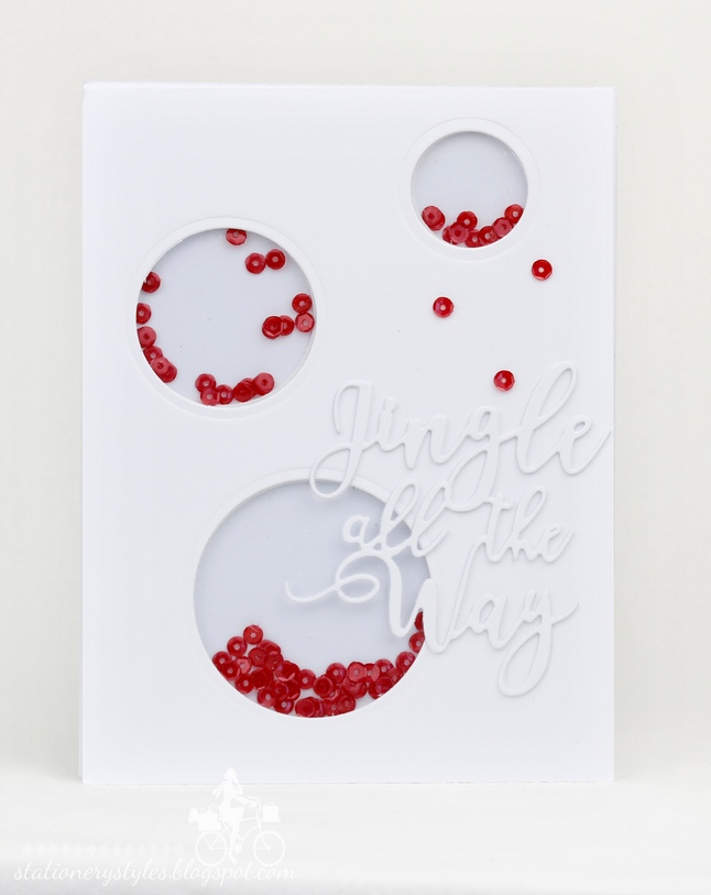 Next up in the Fun and funky category : ) is a fun little shaker card. I simply cut three circle shapes for the Shaker feature - assembled it and finally added the #51-257 Jingle All The Way Creative die and I was done : ) Clean and simple - Super Fun! and a tiny bit funky : )