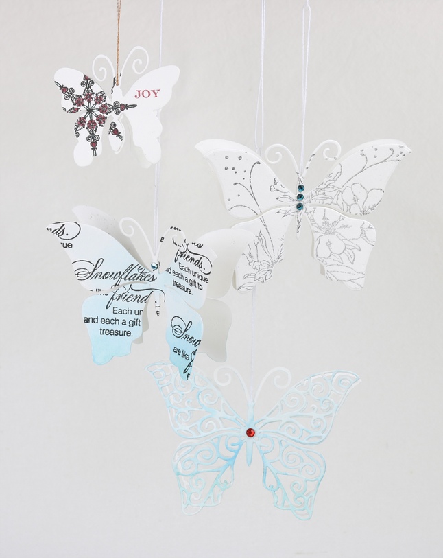 I have created some ornaments using Butterfly dies by simply die cutting two each of each butterfly and gluing them together with some string sandwiched in between just at the body. As you can see I have dolled them up a bit. I will explain more and give a link to the product I used in the pictures below. ALL the ornaments were cut from water color paper.